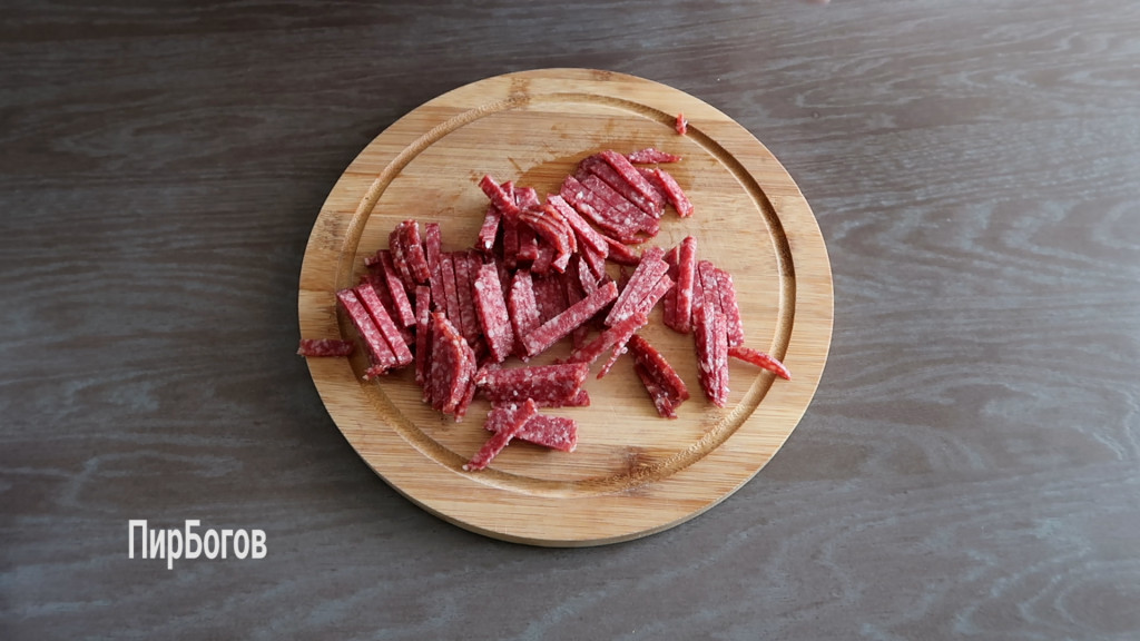Колбасу нарезаем тонкими полосками.